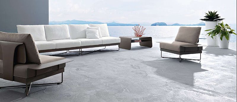 Hay módulos de uno y dos asientos, chaise longue (que también sirve como pieza rinconera) y doble chaise longue como cama exterior. Tanto los cojines como la tapicería son resistentes a la intemperie. El sofá se complementa con mesas rinconeras bajas a juego y mesa de centro monocolor de aluminio doblado y sobre en diversos acabados.